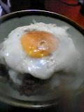 「焼き物・ハンバーグ」の要領でハンバーグを作り、通常のハンバーグより平たくし、焼く。キャベツを千切りにし、塩少量でもんでおく。沸騰したお湯の中におたまにのせた生卵をおたまごと入れ、軽く揺すりながら半熟卵を作る。丼にご飯・キャベツ・ハンバーグ・卵の順にのせ、ソース(「ハンバーグ」参照」をかける。 |