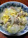 鶏もも肉を一口大に切り、水・ダシの素で煮る。タマネギも加えて煮、みりん・薄口醤油で味付けをする。卵と水溶き片栗粉を一緒に溶いたものを(かきたま汁の要領で)箸を伝わせながら流し込み、少し煮る。 |