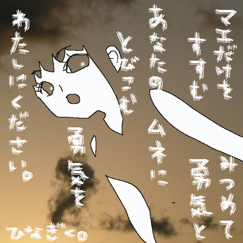 20040606 『マエだけをみつめてすすむ勇気と あなたのムネにとびこむ勇気を わたしにください。』 どうしようもないほどあなたが好きなわたしだけど、 勇気がないばっかりに前だけを見つめて進む事ができない。 あなたの胸に飛び込む事ができない。 こんな臆病なわたしの真意に気付いてくれているといいんだけれど。